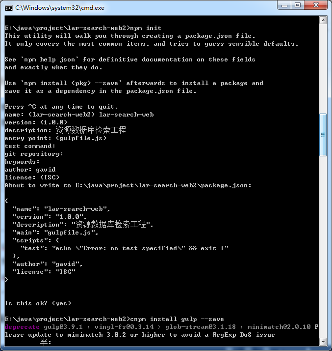 cmd进入项目目录,执行命令,生成package.json文件