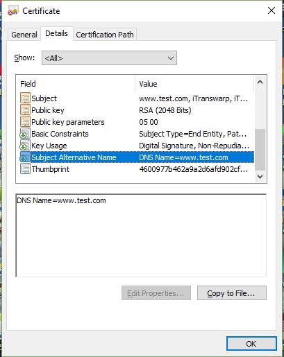 12[ alt_names ]DNS.1 = www.test.com注:这里填入的即为Subject Alternative Names的域名名称