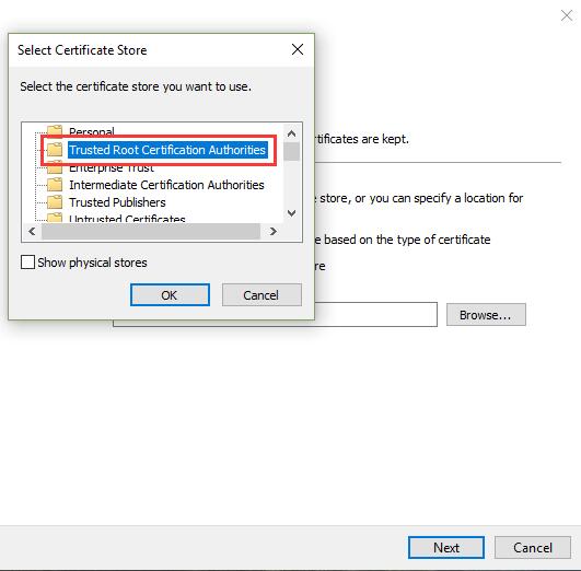 - 选择“Trusted Root Certification Authorities” 点击“OK”