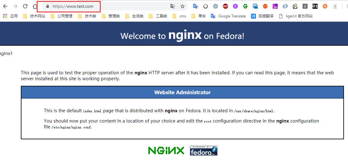 1234567server {ssl on;ssl_certificate /etc/nginx/ssl/www.test.com.crt;ssl_certificate_key /etc/nginx/ssl/www.test.com.key;listen 443 default_server;listen [::]:443 default_server;}重启nginx服务